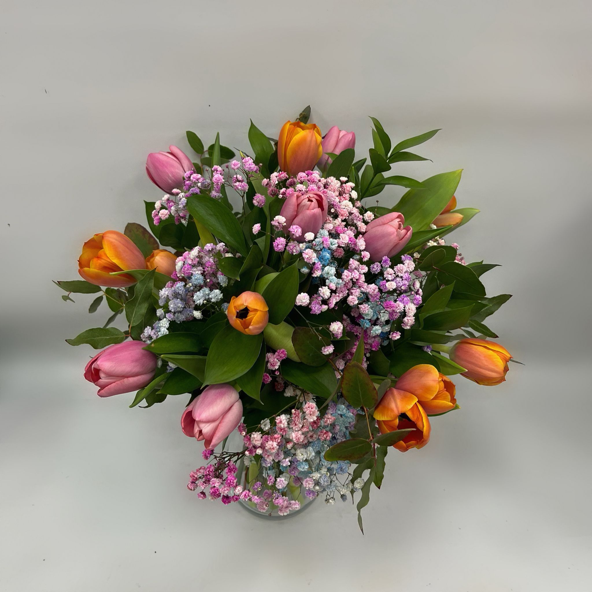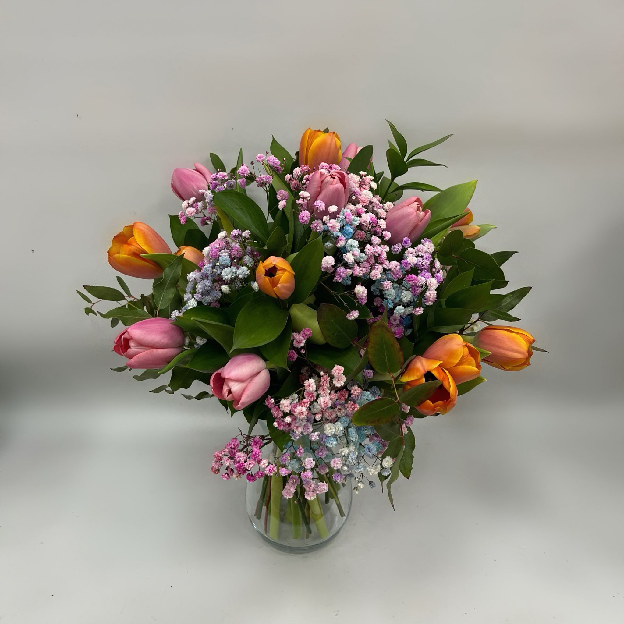 Descubre la belleza de nuestro exclusivo Ramo, una obra maestra floral que mezcla la elegancia de tulipanes en tonos rosa y naranja con la delicadeza de flores de llenado. Este ramo, cuidadosamente diseñado, aporta frescura y alegría a cualquier ambiente.
